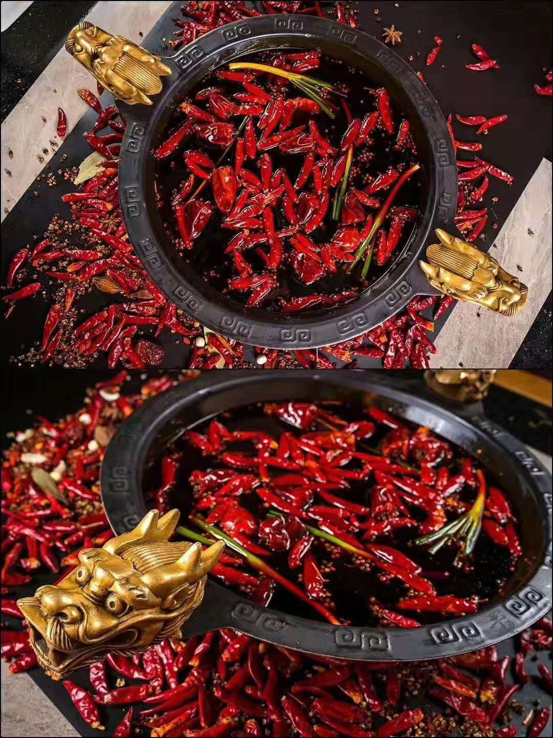 而成都火鍋則香味更加突出,在辣椒和花椒同時(shí)存在的情況下,使用了更多的香料,在綜合和麻辣味道的同時(shí),突出了香料的香味,而成都火鍋在牛油的使用上面也有所差異,會(huì)有色拉油和菜籽油的出現(xiàn),讓整體的感受少一些牛油帶來(lái)的葷腥的味道,香味更加的容易出來(lái)。