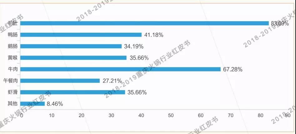 毛肚依然是重慶火鍋必點(diǎn)菜品之王,牛肉超越鴨腸,成為第二位重慶火鍋?zhàn)钍軞g迎的葷菜。