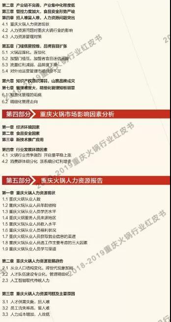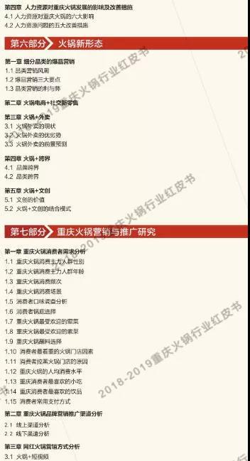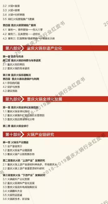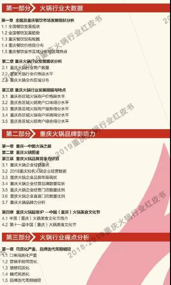 讓火鍋行業(yè)從業(yè)者更深入的了解重慶火鍋市場(chǎng),讓重慶火鍋文化傳揚(yáng)全世界,是我們所一直倡導(dǎo)的?!吨貞c火鍋紅皮書》根據(jù)大眾點(diǎn)評(píng)和美團(tuán)網(wǎng)的數(shù)據(jù)收集,及對(duì)對(duì)重慶主城九區(qū)餐飲(火鍋)市場(chǎng)進(jìn)行了摸底式調(diào)研,分析餐飲(火鍋)類商戶的相關(guān)數(shù)據(jù)得出結(jié)果,為學(xué)習(xí)交流之目的,我們特將目錄公布如下以供試閱。